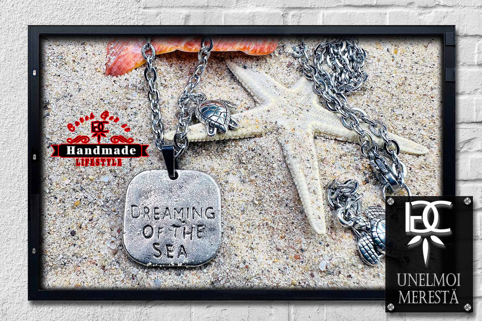 Das Unelmoi Merestä (Finnisch und bedeutet vom Meer träumen) eine Edelstahlhalskette mit einer gravierten Palette "Dreaming of the Sea" und Schildkröten in Edelstahl. Sehr ausgefallen und Detail getreu gestaltet, mit einer Länge von 50 + 5 cm und durch den praktischen Karabiner Verschluss ist die Halskette schnell angelegt.