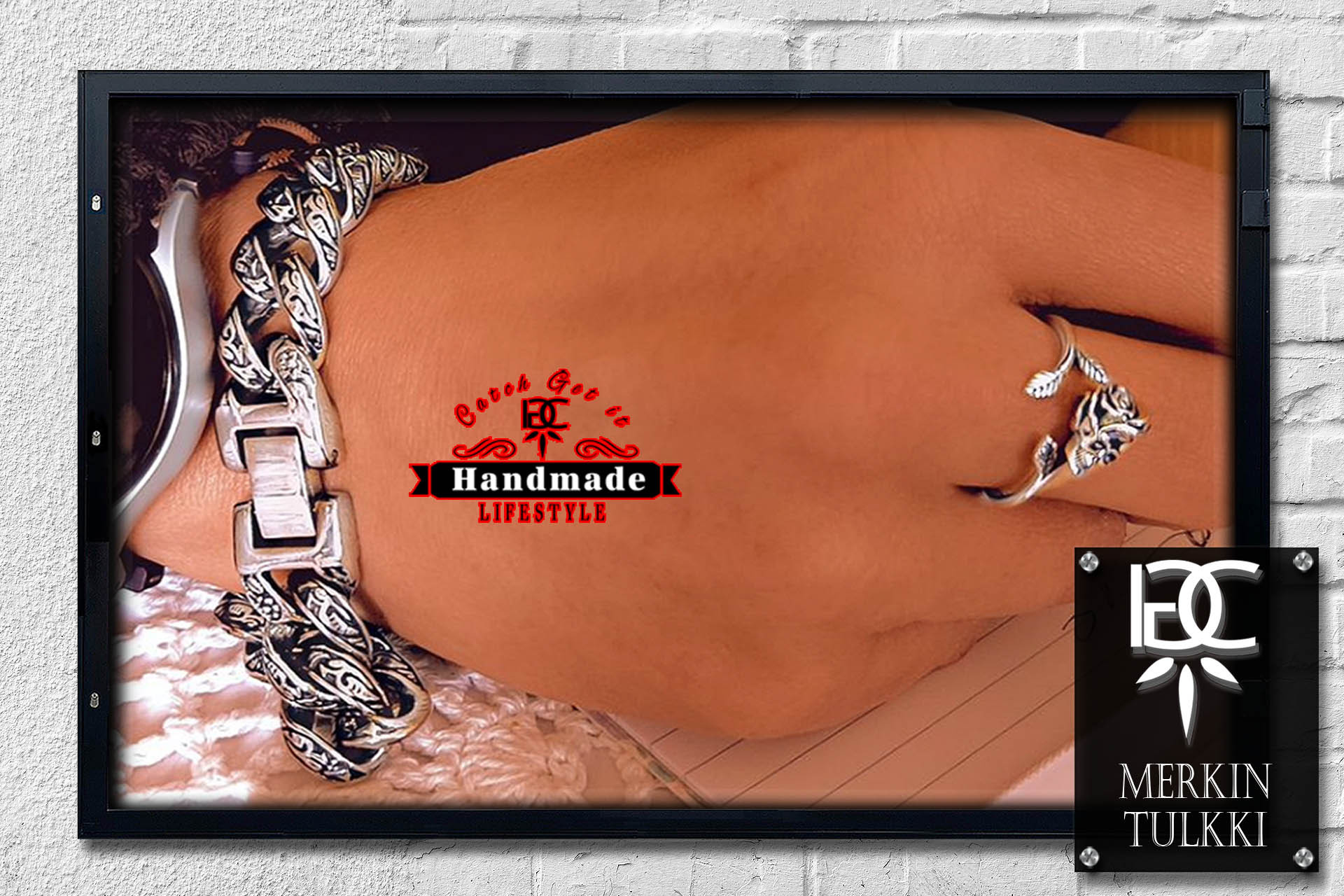 Das Merkin Tulkki (Finnisch und bedeutet der Zeichendeuter) ein Armband mit aufwendigen nordischen Verzierungen als breite schwere Panzerkette. Sehr ausgefallen und Detail getreu ausgearbeitet und anschließend aufwendig geschwärzt, mattiert, und poliert. Durch seine Faltschließe ist das Armband schnell angelegt.