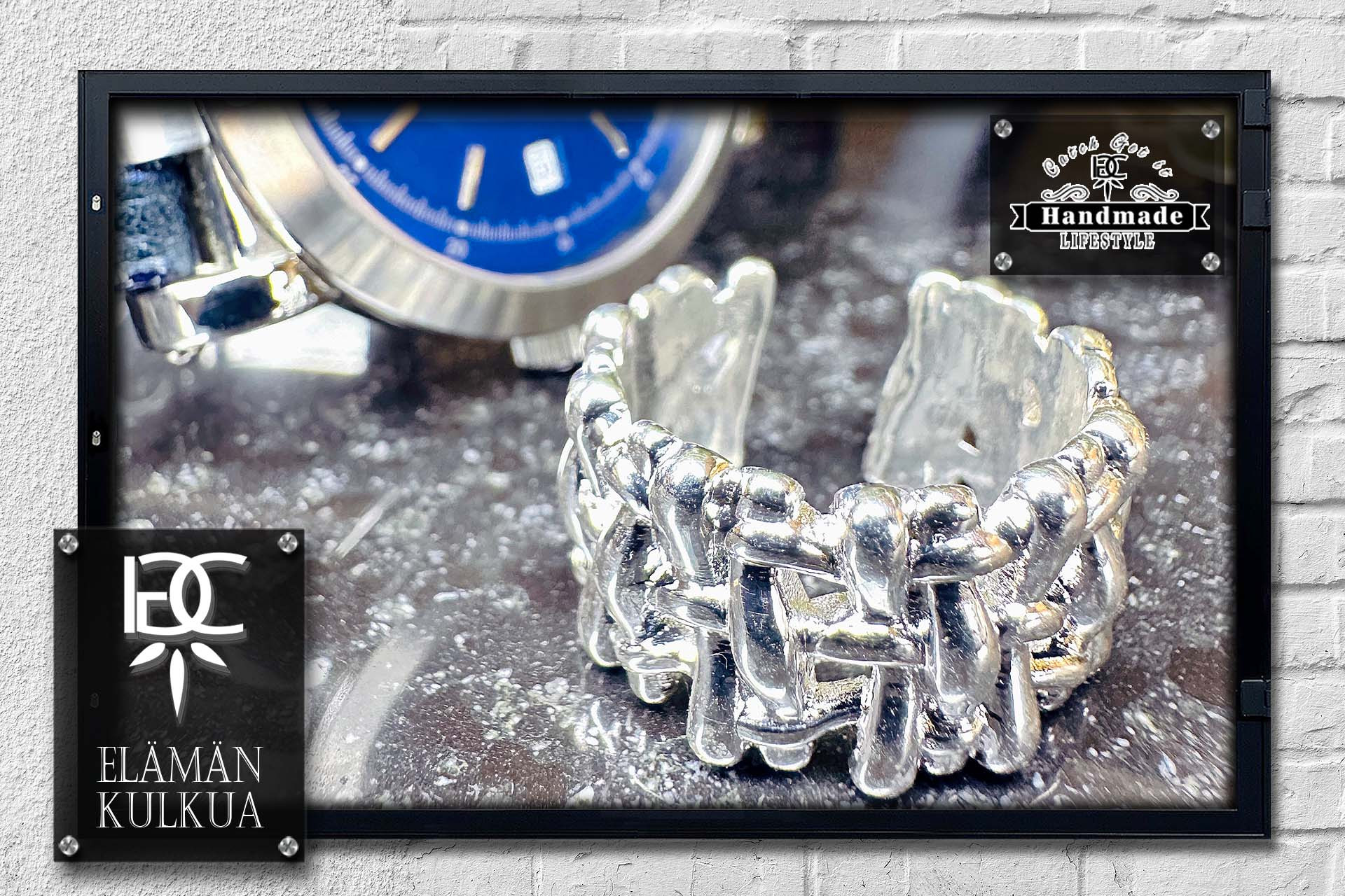 Das Elämän Kulkua (finnisch und bedeutet Verlauf des Lebens) ein breiter 925er Silber Ring als Band Ring im modernen Design eines Gittergewebes sowohl Außen als auch Innen Seite des Ringes. Edel und Zeitlos gestaltet und durch sein offenes Design verstellbar. Dadurch lässt sich der Ring auf eine Ringgröße zwischen 52(16.4) bis 60(19.7) leicht verstellen (ausgeliefert für eine Ringgröße von 54(17.3) ) und ist damit schnell angelegt.