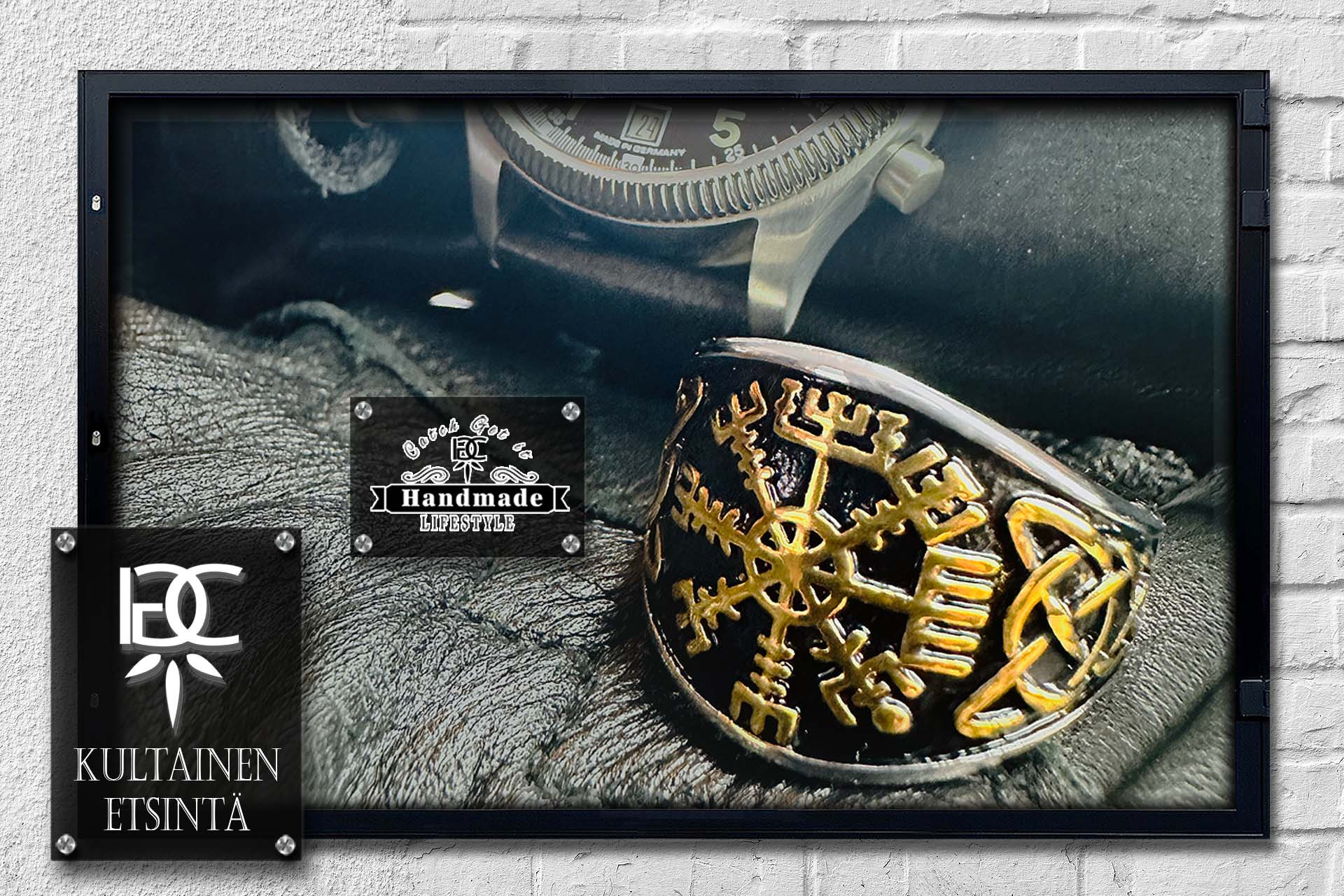 Das Kultainen Etsintä (Finnisch und bedeutet goldener Wegfinder) ein Edelstahlring in Form eines flachen Siegelrings mit einem nordischen Kompass Vegvisir sowie mit je Ring Flanke keltischen Knoten verziert, geschwärzt und vergoldet. Sehr ausgefallen und Detail getreu gestaltet. Der Ring ist in 7 Ringgröße zwischen 54(17,2) bis 66(22,3) erhältlich.