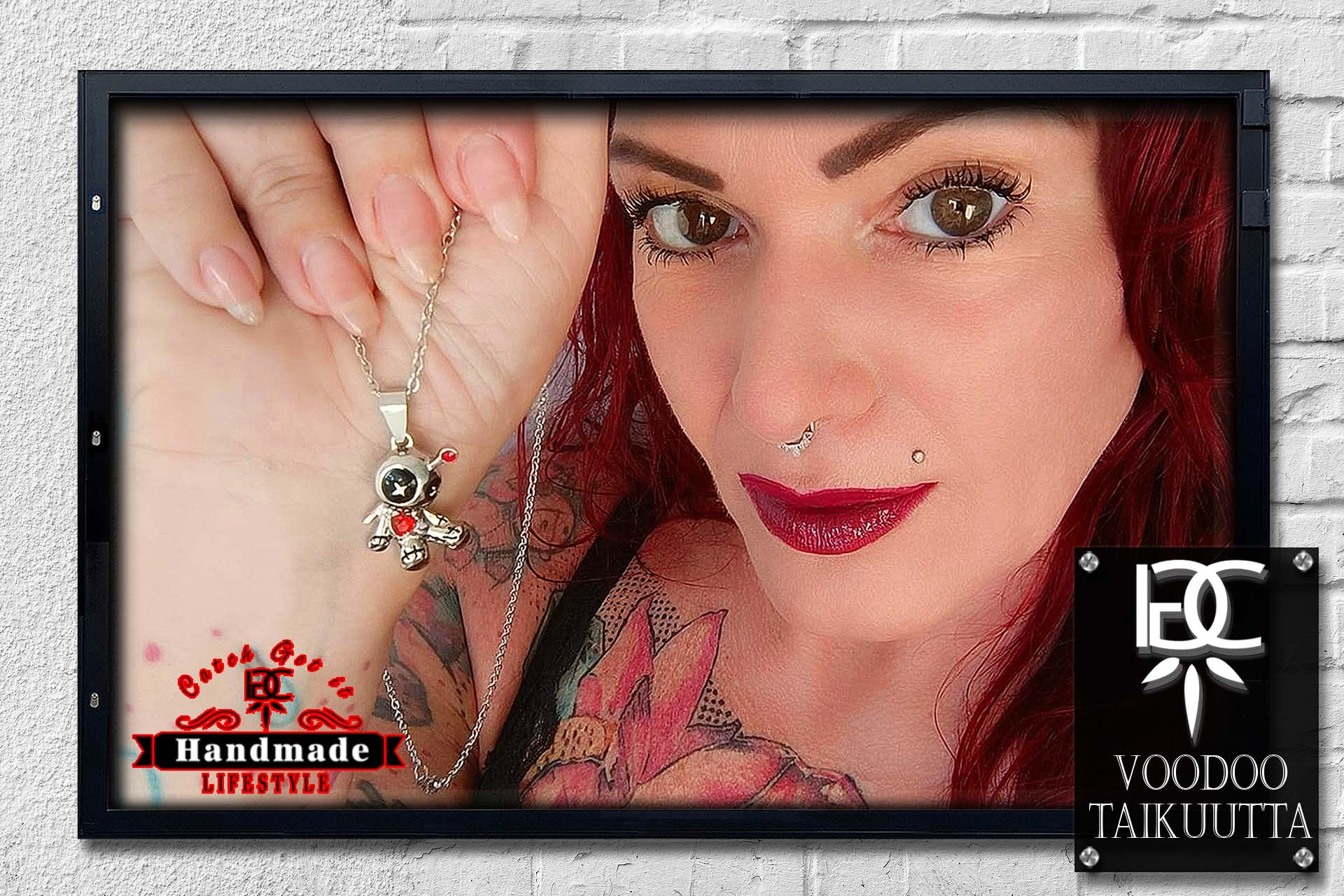 The Voodoo Taikuutta (Finnish and means the Voodoo Magic) a stainless steel necklace as a funny Voodoo doll, decorated with red zirconia as a heart. Very unusual and true to every detail, with a length of 55 cm and the practical carabiner clasp means the necklace can be put on quickly.