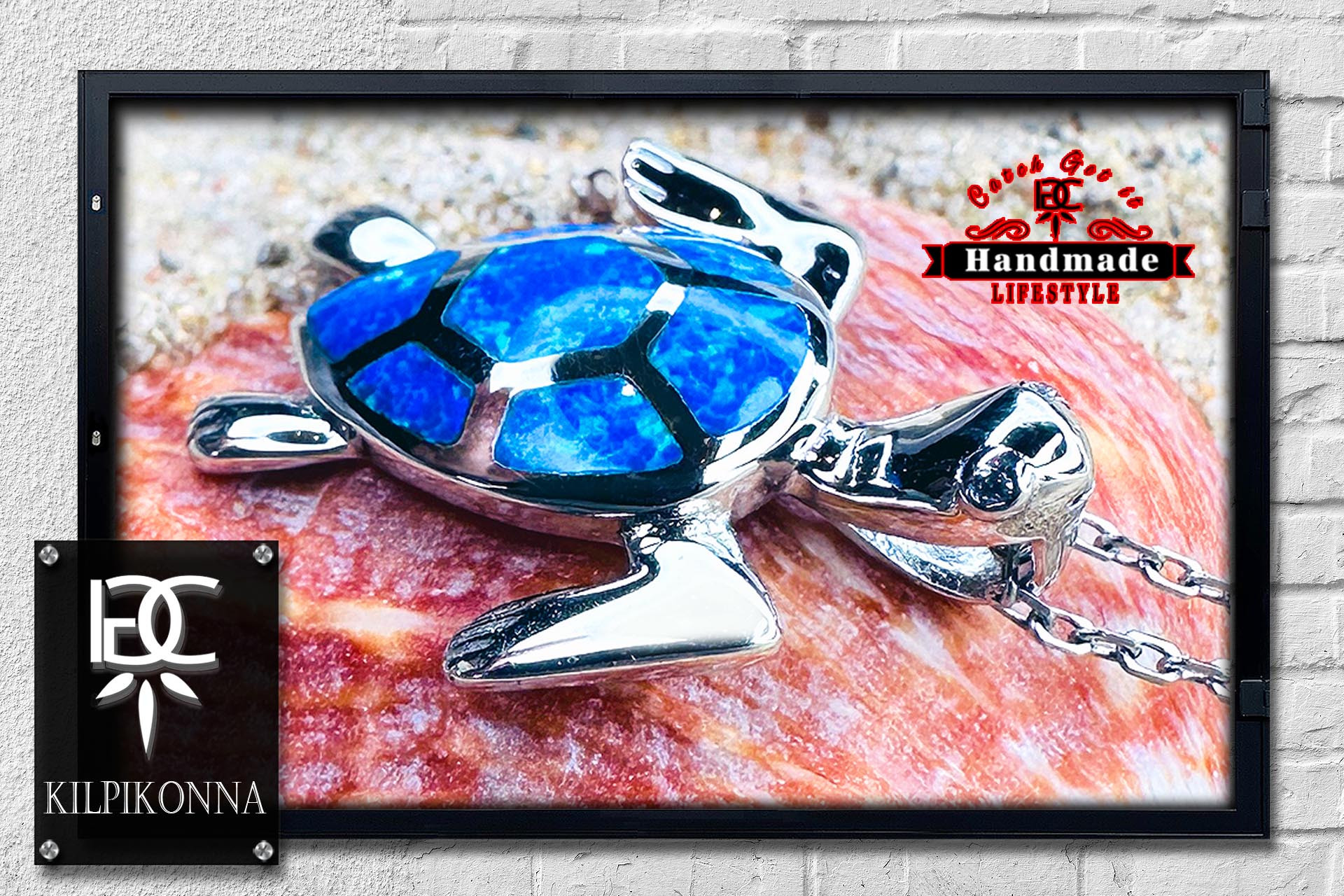 The Kilpikonna (Finnish for turtle) is a 925 silver necklace with a turtle and a shell decorated with blue opals and white zirconia as eyes. Elegantly designed with a length of 45 cm and thanks to the practical spring ring clasp, the necklace can be put on quickly.