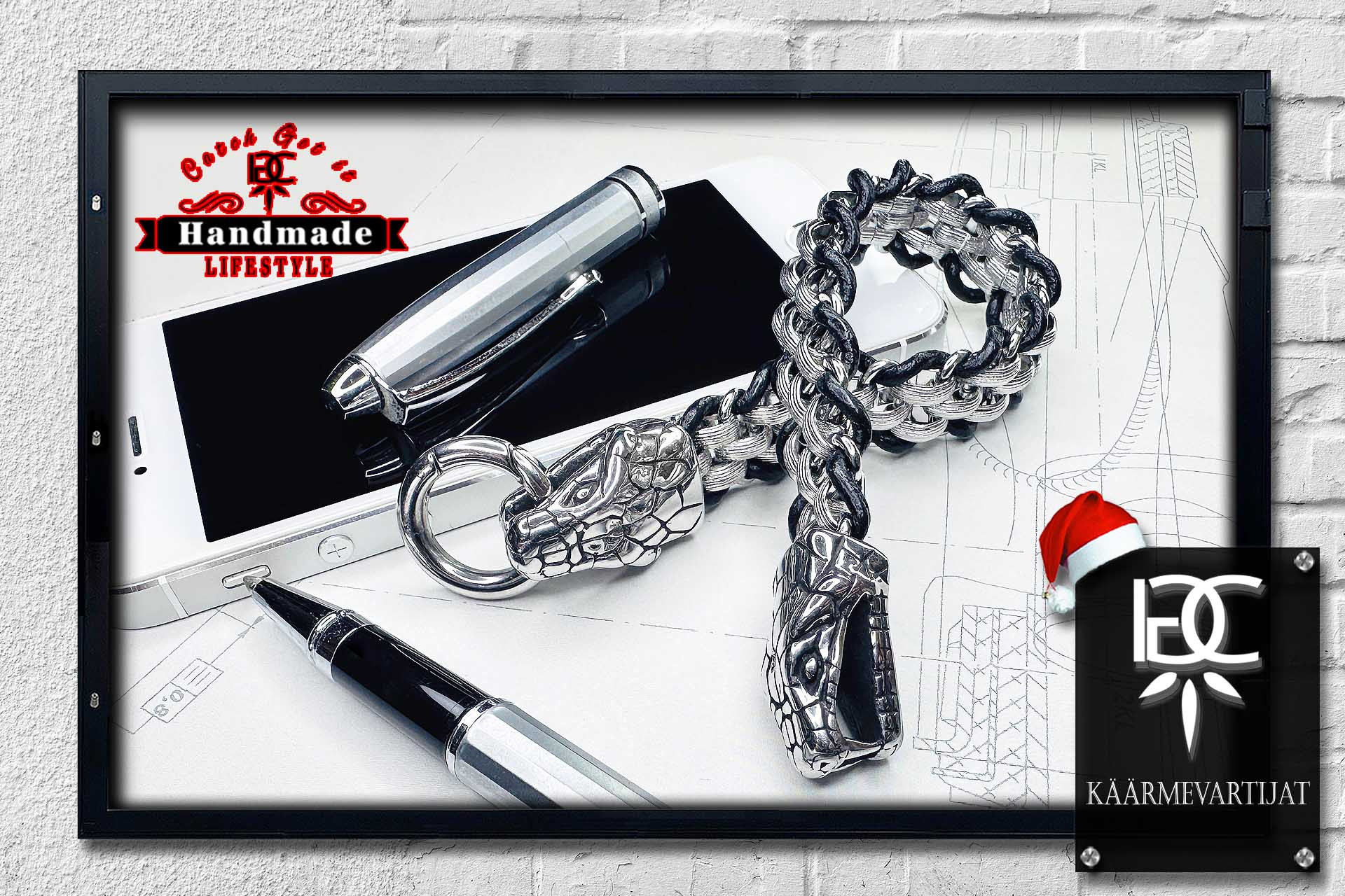 The Käärmevartijat (Finnish and means the snake guardian) a bracelet with elaborately decorated snake heads and spring ring as a clasp in the design as a wide heavy link chain with black braided leather. Very unusual and true to detail and then elaborately blackened and polished. The bracelet can be put on quickly thanks to its spring ring clasp. The bracelet is available in lengths of approx. 21.5 to 22 cm.